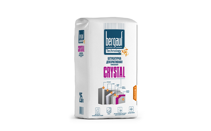 Штукатурка декоративная Bergauf Crystal используется под покраску. Подходит для следующих типов основания: кирпичная кладка, бетон, железобетон, ячеистый бетон, цементная, цементно-известковая штукатурка, гипсовая щтукатурка, гипсокартон. Для внутренних работ в помещениях с нормальной и повышенной влажностью, а также для наружных работ.