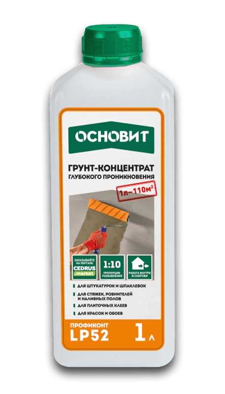 Грунт-концентрат глубокого проникновения ОСНОВИТ ПРОФИКОНТ LP52 предназначен для предварительной обработки и обеспыливания минеральных оснований. Применяется для подготовки поверхности под последующее нанесение отделочных материалов: штукатурок, шпаклёвок, стяжек, ровнителей, наливных полов, плиточных клеёв, гидроизоляции, лакокрасочных материалов. Для внутренних и наружных работ. Морозостойкий при хранении. Разбавляется водой в соотношениях 1:2; 1:3; 1:4; 1:5; 1:6; 1:8; 1:10.