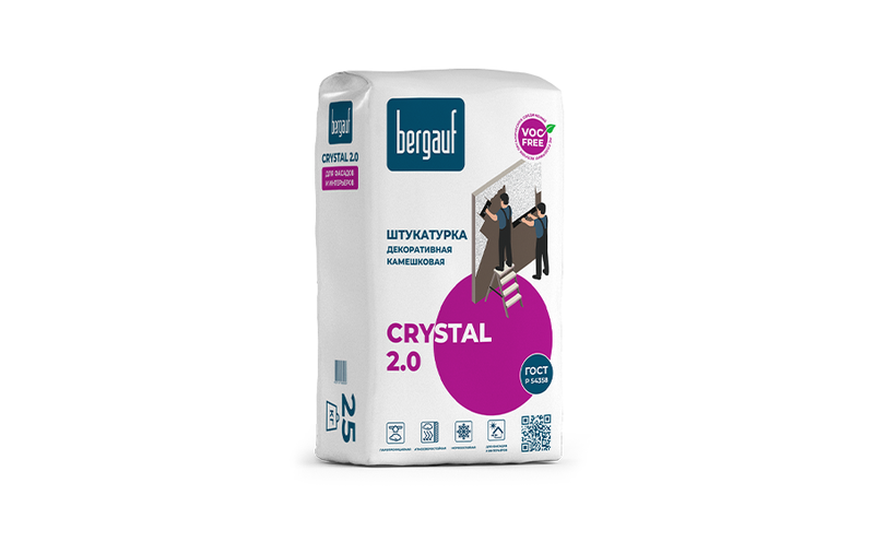 Штукатурка декоративная «Bergauf Crystal» в упаковке 25 кг — это смесь для финишной отделки фасадов. В составе — мраморная мука, цемент, а также специальные добавки, повышающие пластичность готовой смеси и прочность после высыхания.